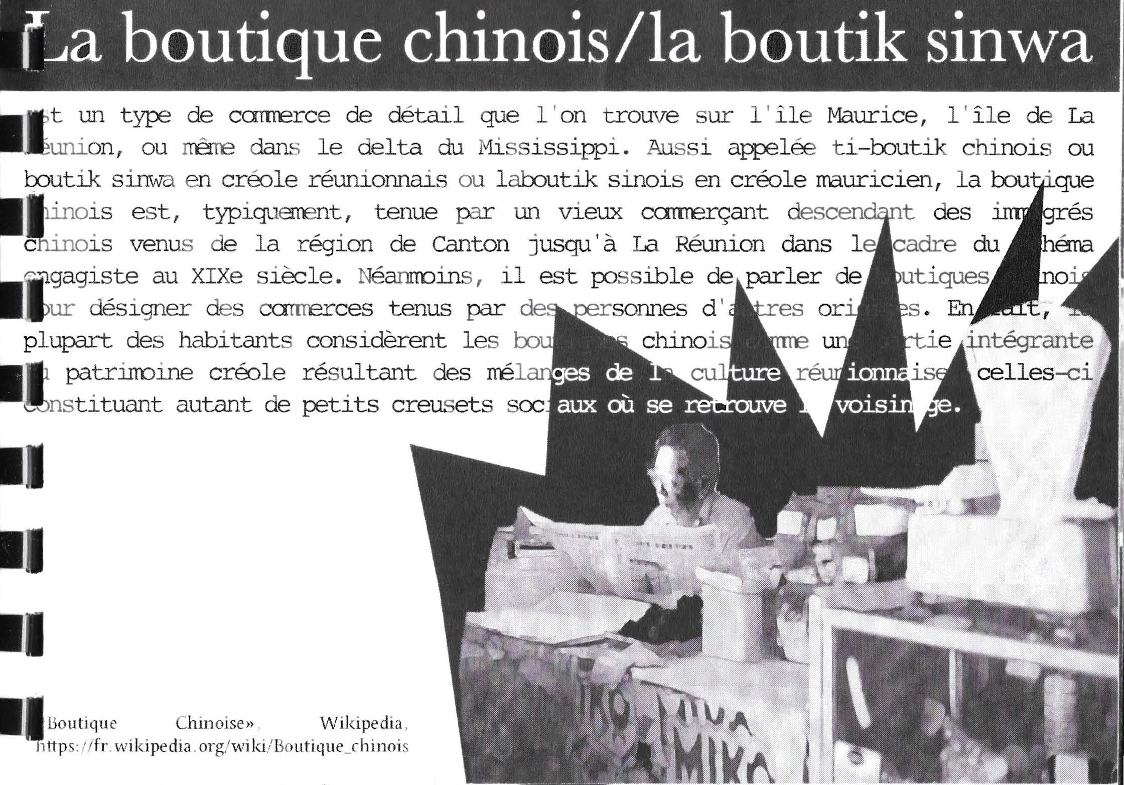 "Une espèce d'épicerie de quartier tenue par un immigrant chinois descendant de la province de Canton à l'Île de la Réunion. La boutique chinois vend généralement des limonades ou de l'alcool, des gâteaux et snacks salés, goûters et aussi des biens de première nécessité."